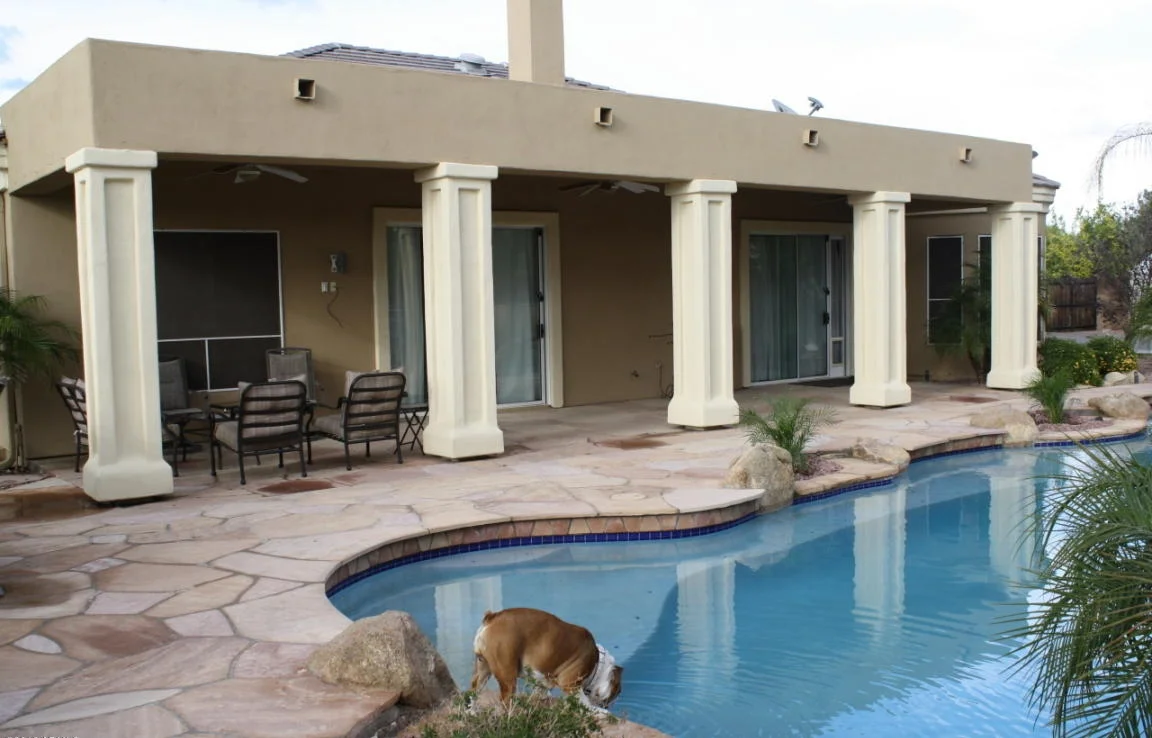 I somewhat feel sorrowful for our four-legged friend because by all accounts, this entire backyard has been sealed under rock and mortar. There's no cool grass to roll around in or trees to sit under and enjoy the shade of a spring day. I have to imagine the owners needed to take their family pet on multiple daily walks so they could relieve themselves on a surface other than solid stone. Having access to jump in to a refreshing pool whenever the mood strikes them somewhat makes up for a lack of sod to spread out on I suppose.