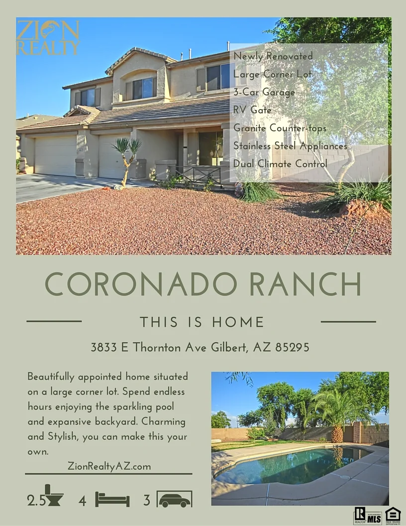 Members of the Coronado Ranch subdivision can enjoy multiple neighborhood green belt areas, children's playgrounds, basketball courts, and community splash pad. Just minutes away from freeway access, Mesa/Gateway Airport, ASU polytechnic campus, shopping, and award winning Gilbert restaurants. Look for 3833 E. Thornton Ave to be listed soon!